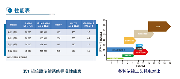 在進(jìn)水氯化鈉濃度7%的條件下,超倍膜濃縮系統(tǒng)運(yùn)行的典型電耗在5-9kwh/噸給水。表1為超倍膜濃縮系統(tǒng)標(biāo)準(zhǔn)性能表。表中類型2比類型1結(jié)構(gòu)復(fù)雜,但運(yùn)行能耗低,具體可根據(jù)客戶需求,進(jìn)行配置。